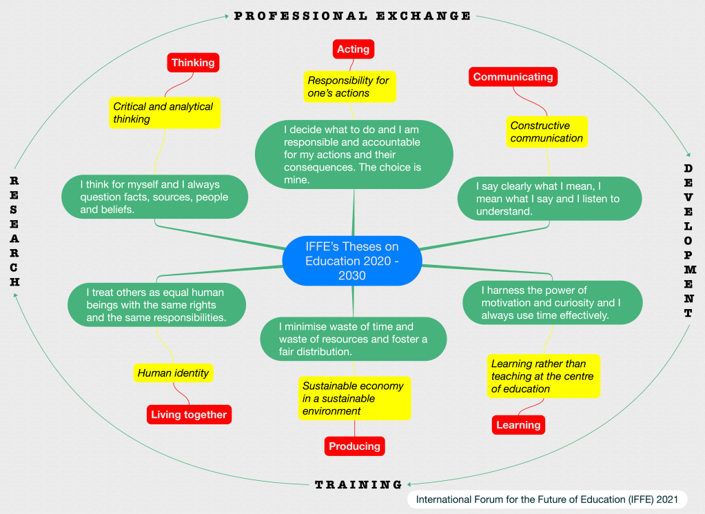 IFFE – The International Forum for the Future of Education – seeks to improve the thinking about and the practice of education through research, development, exploration, exchange and debate. It promotes responsible education and culture, the transmission of cultural and educational knowledge and competences. It seeks to enrich cultural life especially in the area of education and schooling. We have identified the SIX levers/theses which we need to focus on to manage the challenges ahead as societies of free thinking, independent and responsible citizens.